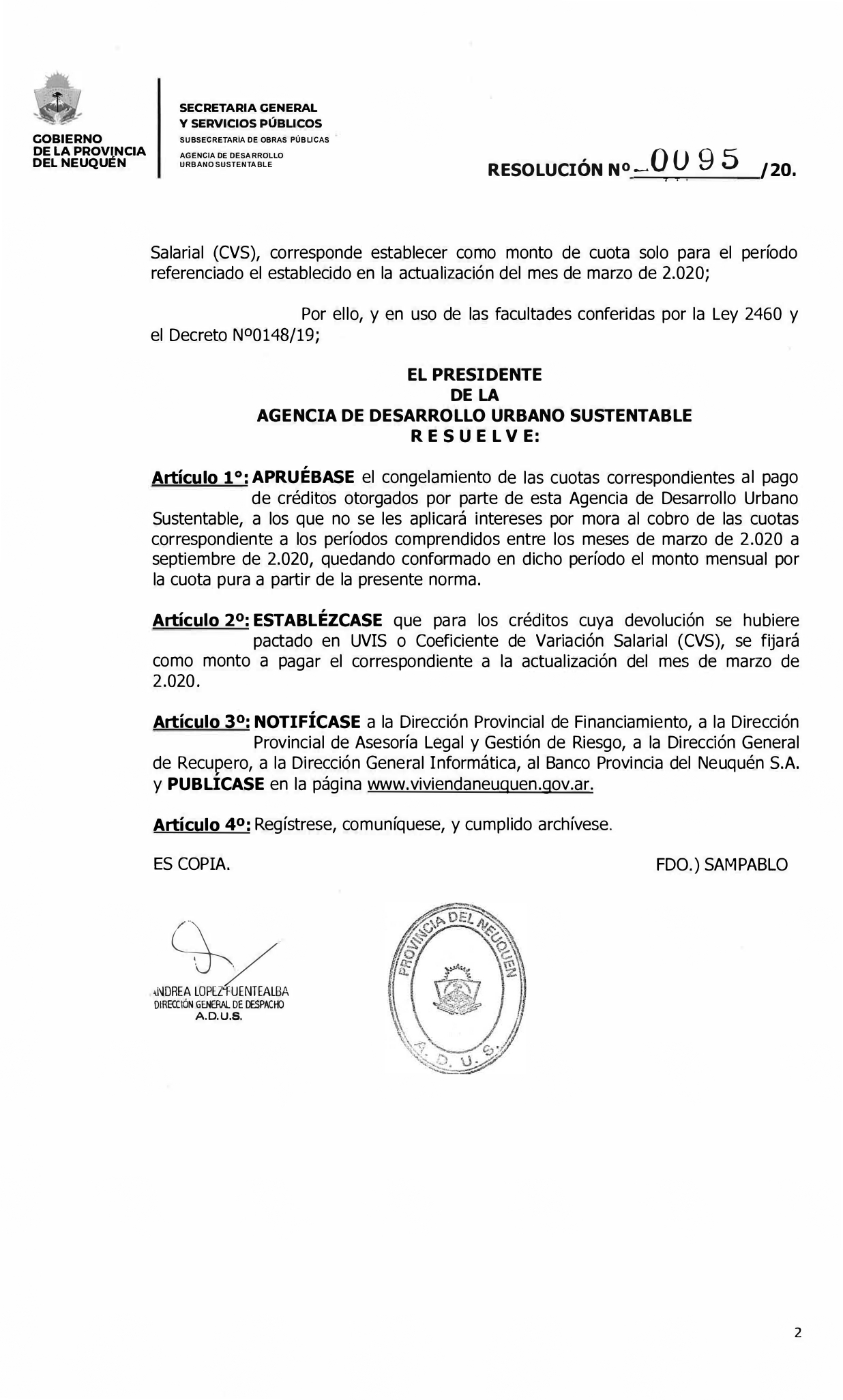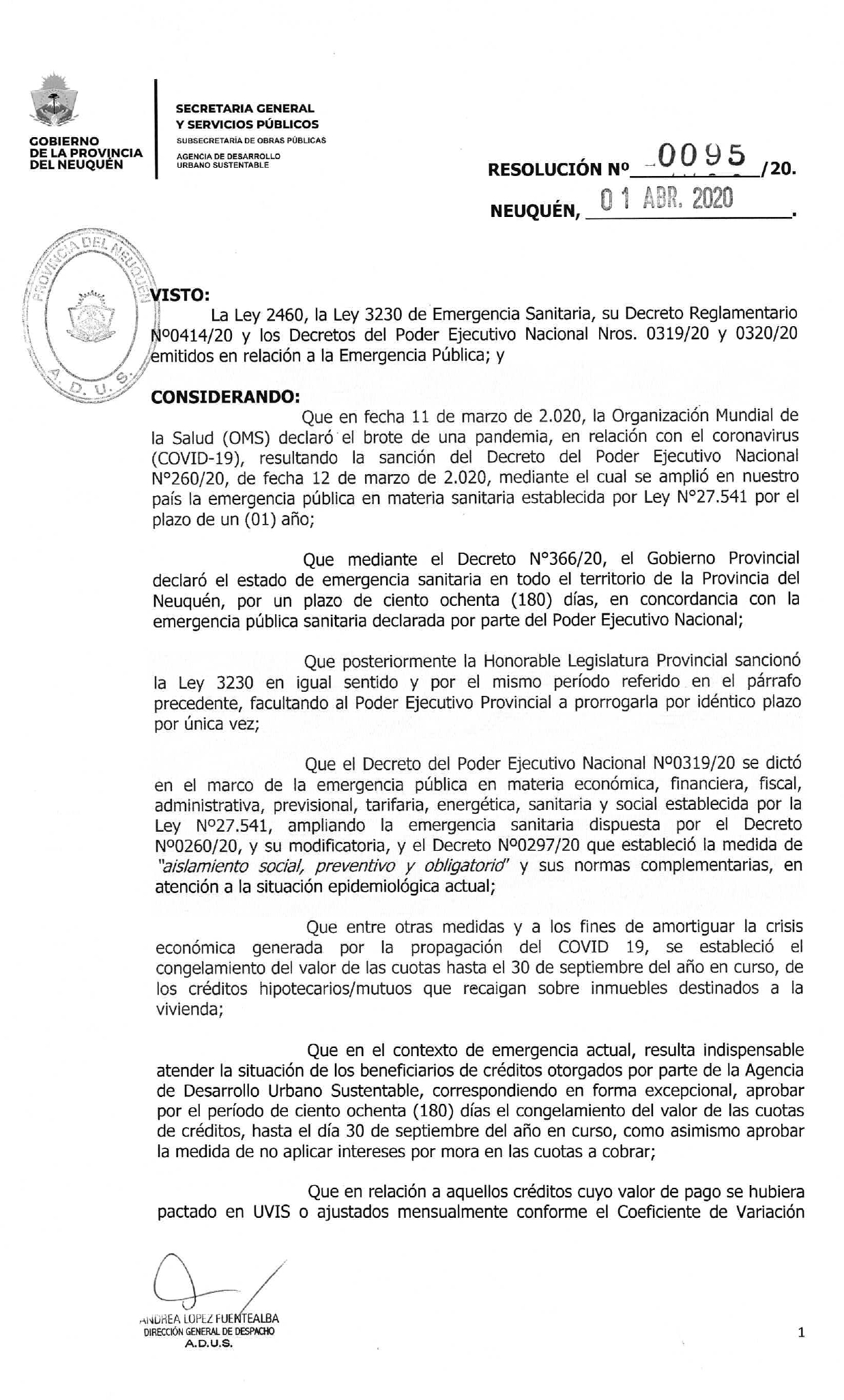La Agencia de Desarrollo Urbano Sustentable de Neuquén (ADUS) informa que desde el primero de abril se resolvió el congelamiento de las cuotas correspondientes al pago de créditos otorgados por el organismo. A su vez, no se aplicarán intereses por mora al cobro de las cuotas correspondientes entre los meses de marzo y septiembre de 2020.